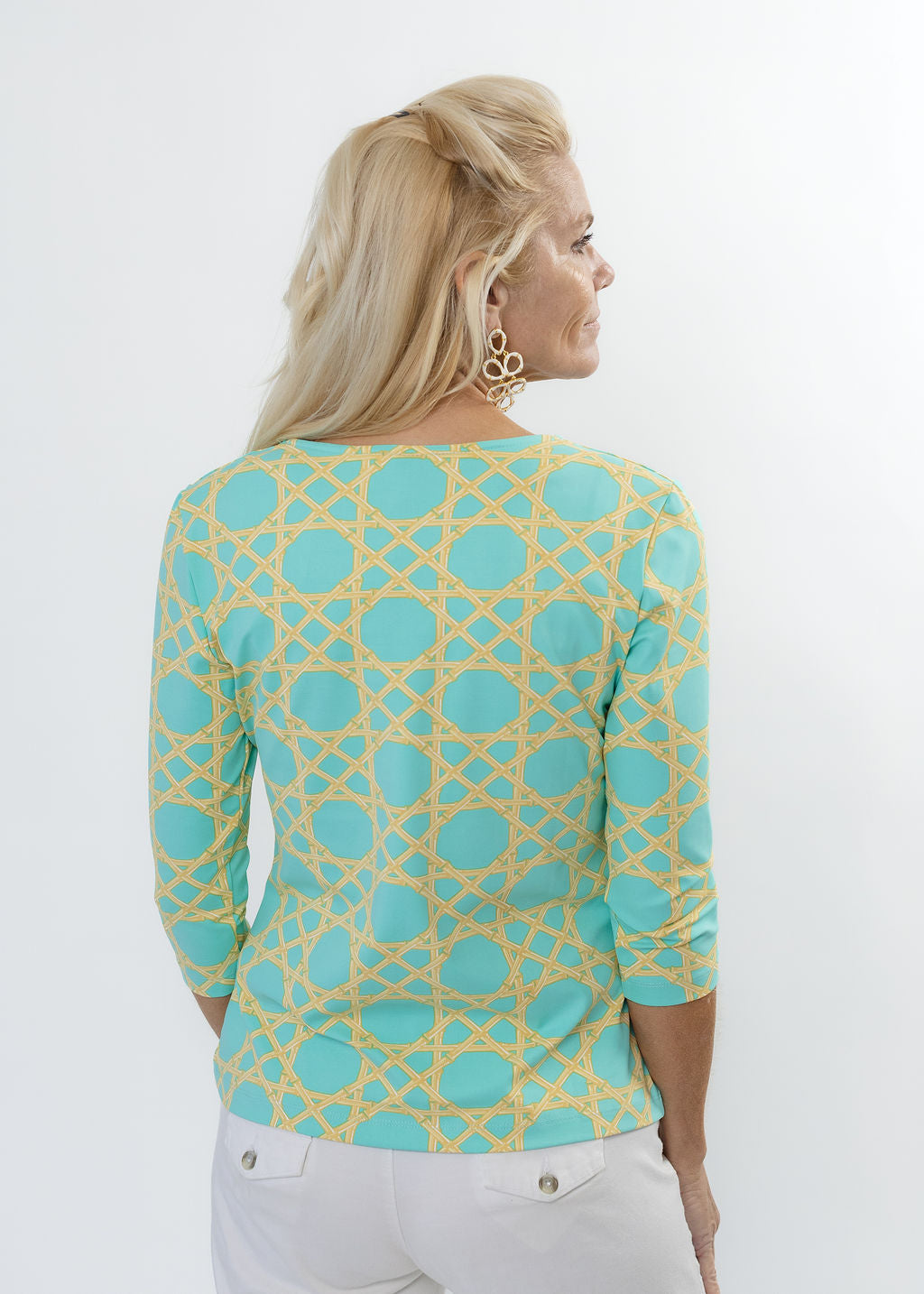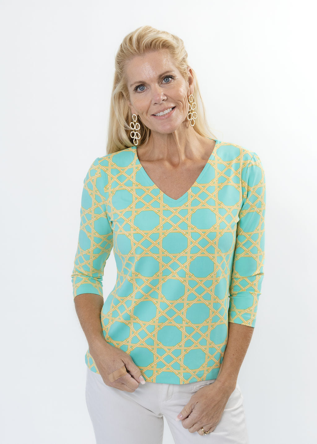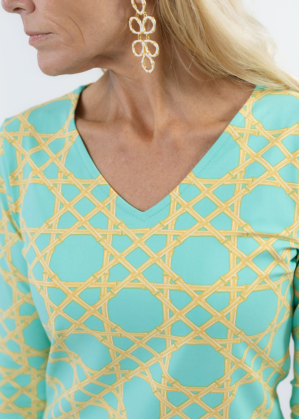 Easy to wear and love, the v neck crew tee features sailor-sailor's signature bamboo print in green and tan. The design looks perfectly polished with everything from jeans to tailored skirts.