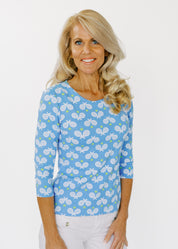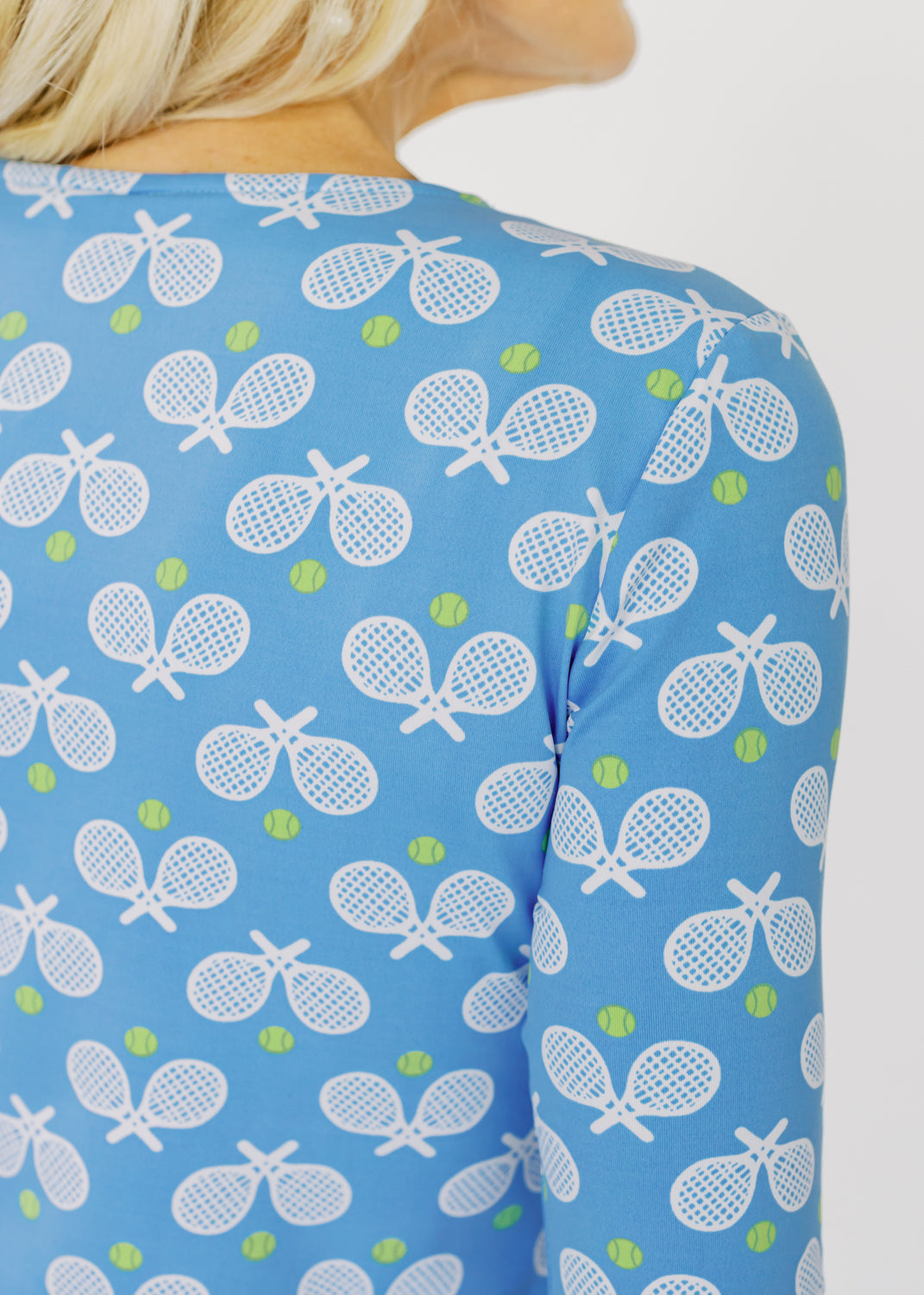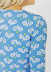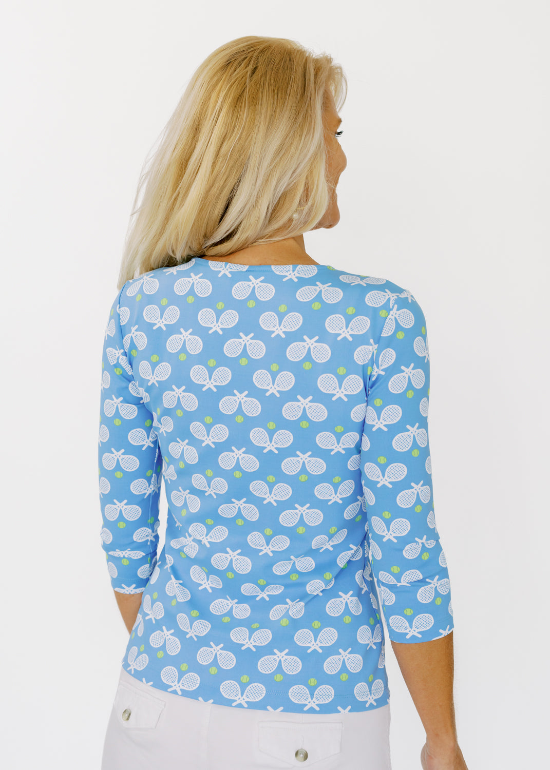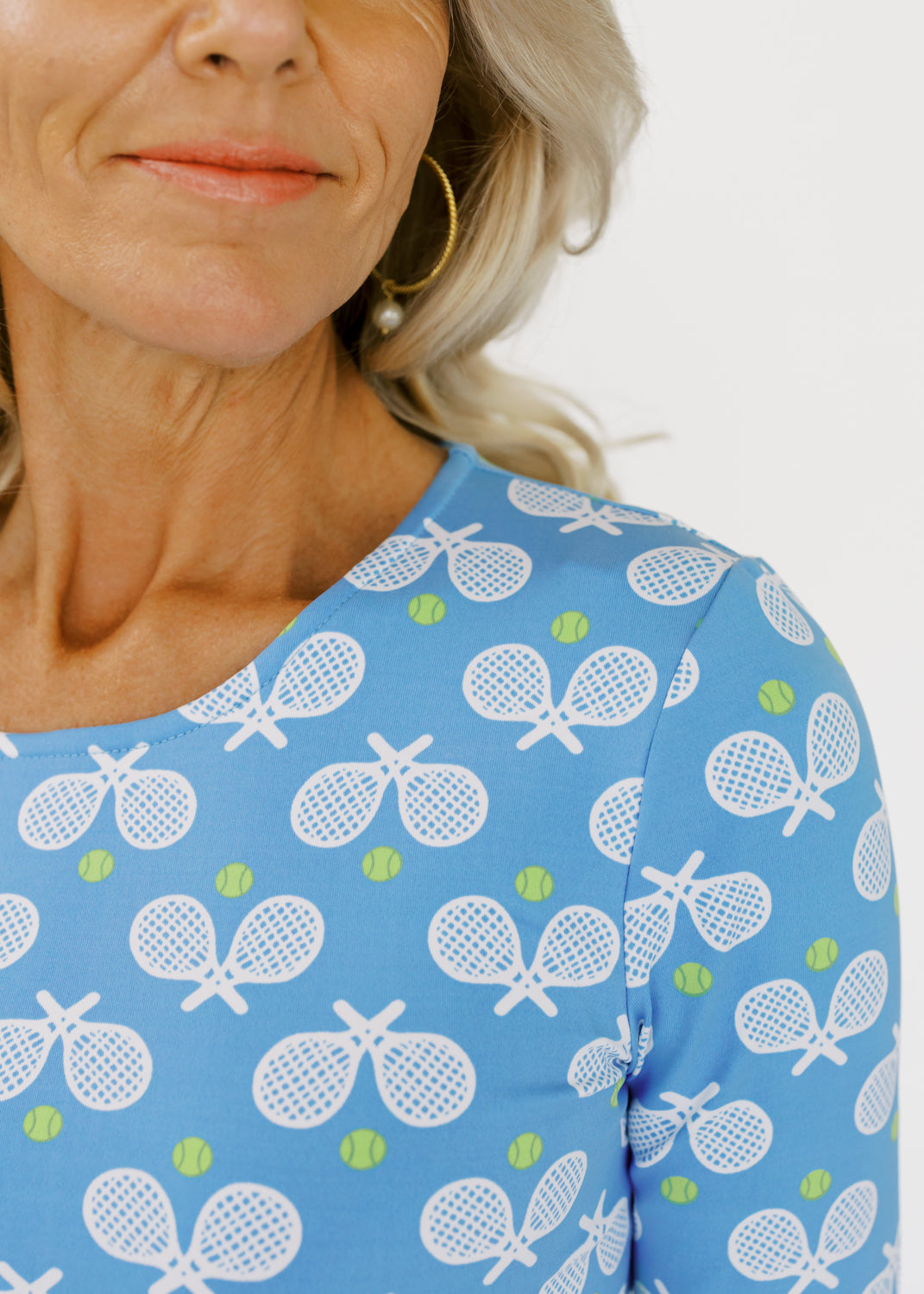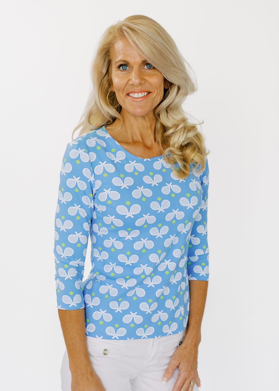 Get on the courts in our sports crew tee printed with racquets and green tennis balls. This themed top has a crew neckline and 3/4 length sleeves for sun protection.