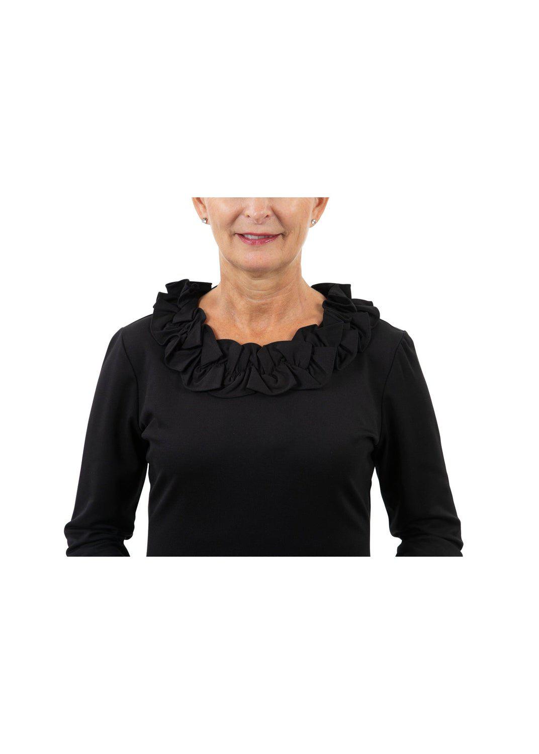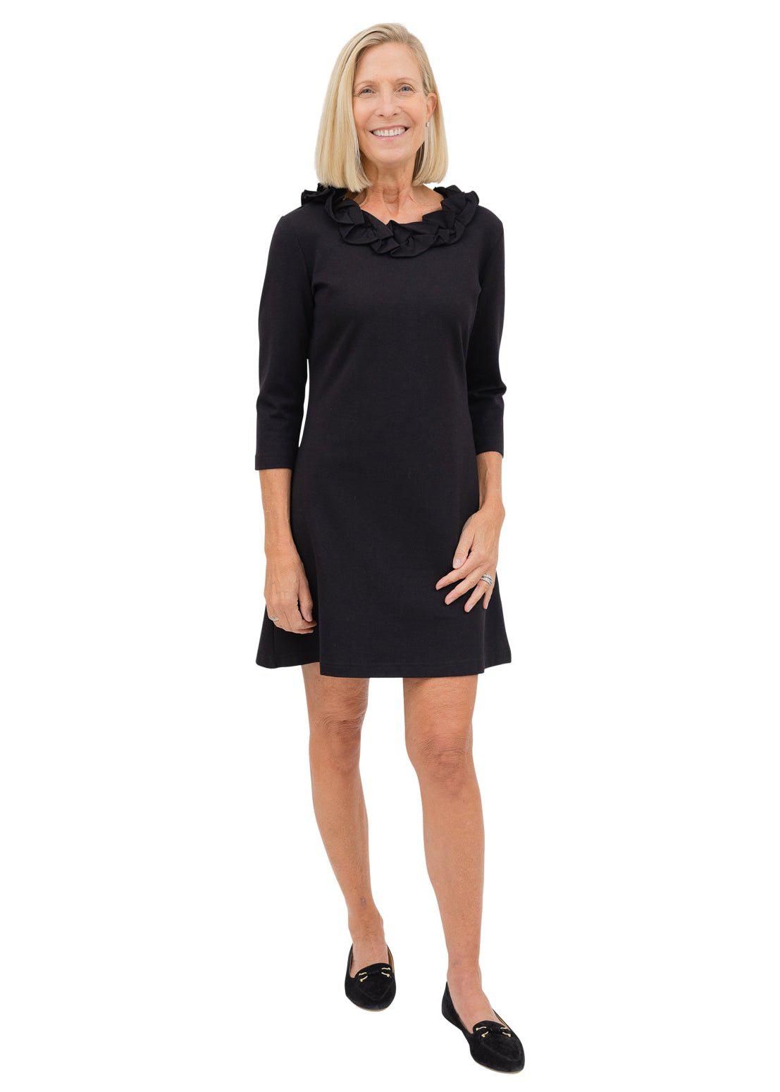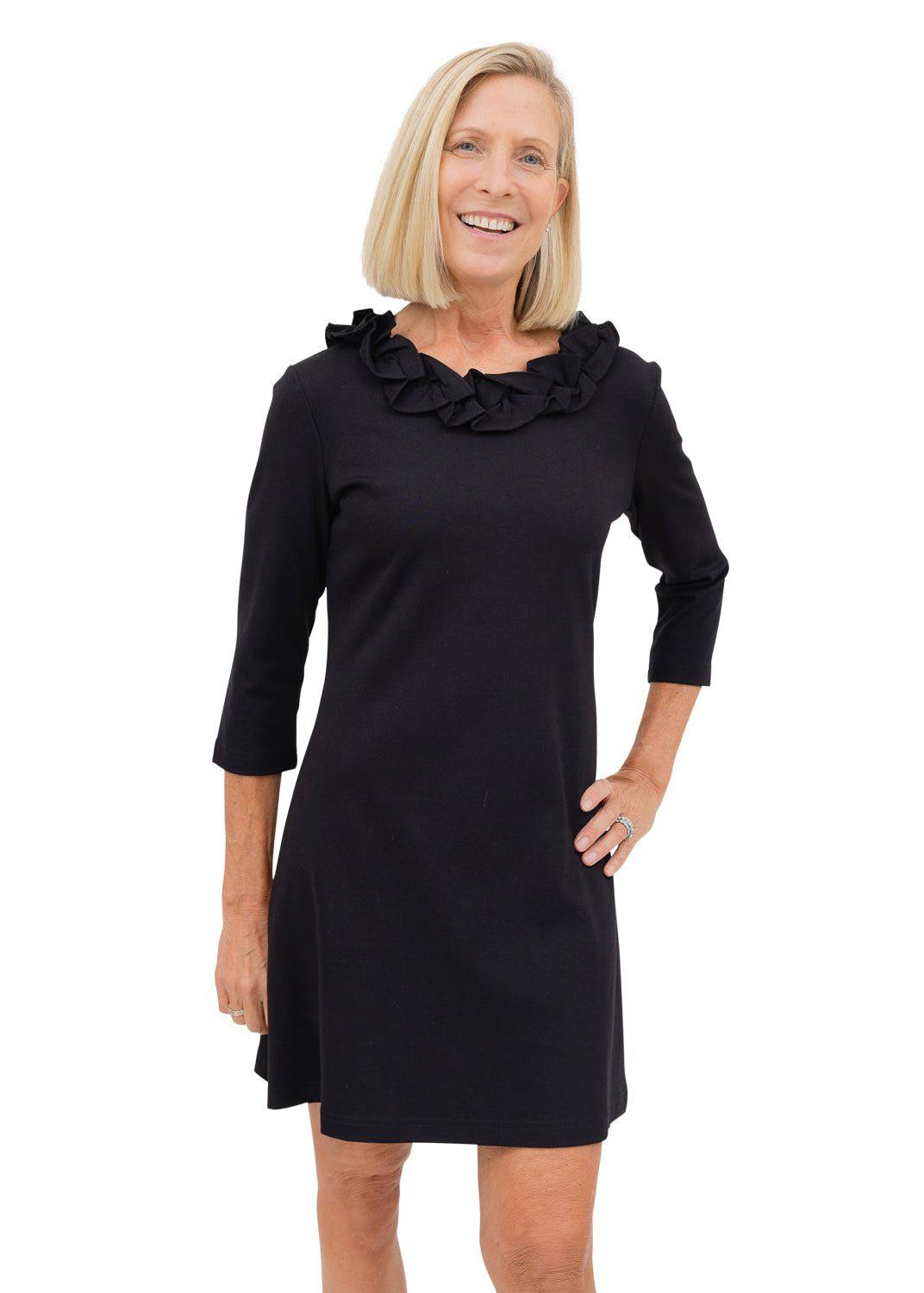The Cricket Collection is comfortable, chic, and a customer favorite! Designed with ruffles around the neck, this sophisticated dress is easy to wear. You'll love the elongating back seams and tailoring. The ponte fabric is a heavier weight fabric than our rayon fabric, making it a great fall/winter option.