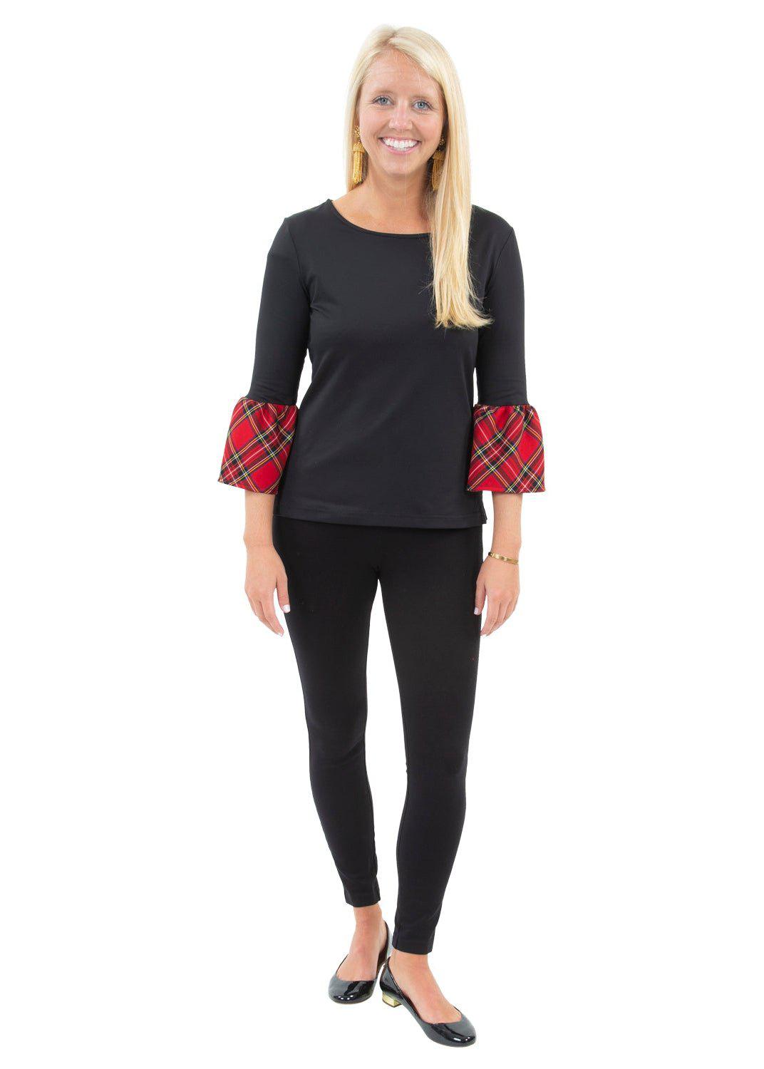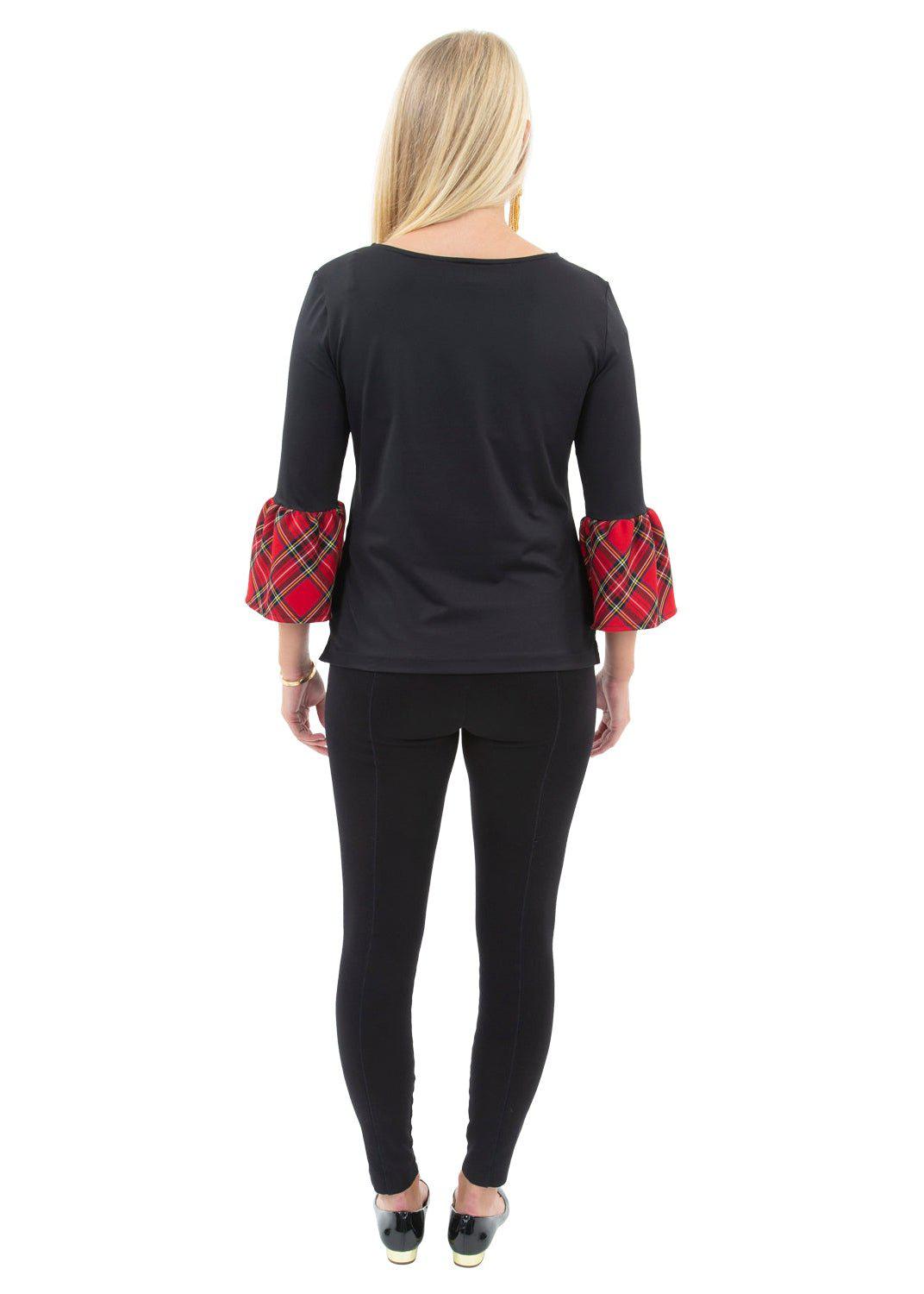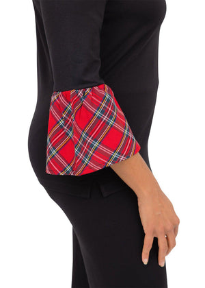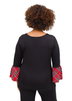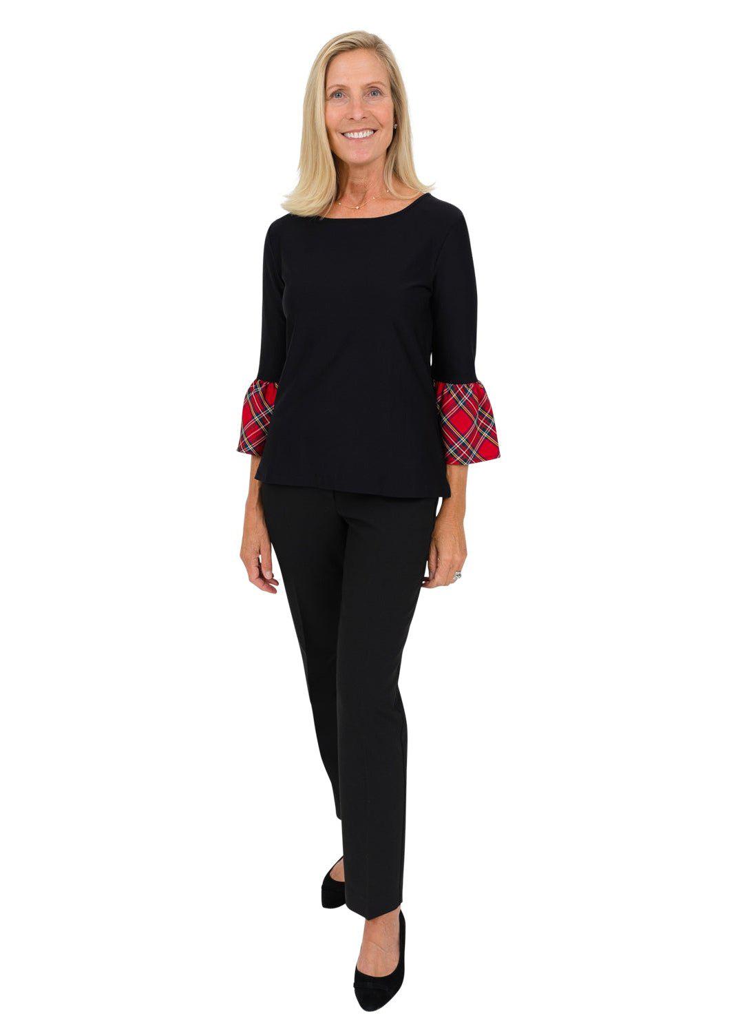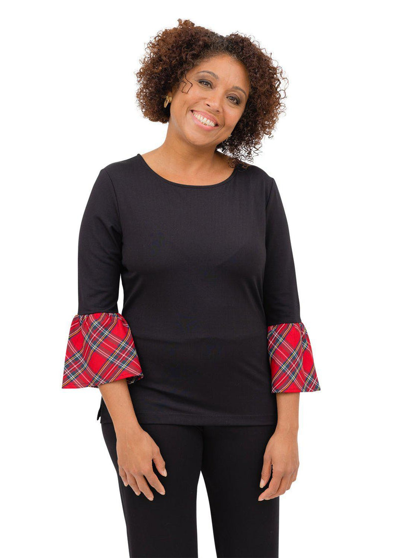 Ring in the holiday season with our bell sleeved top! With red plaid accents, this selection has an easy to wear black rayon blend design. The festive look is clearly quality with American tailoring. Perfect for wearing with slacks or a skirt, this selection is easily dressed up or down.