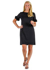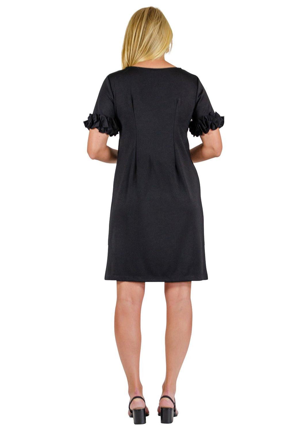 This is your next little black dress! New for the season, this black dress has short sleeves with a ruffled detail. The higher jewel neckline is soft and provides coverage. Hitting the perfect hem length, this dress exudes confidence, style, and ease.