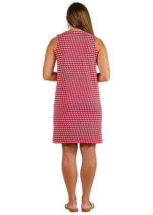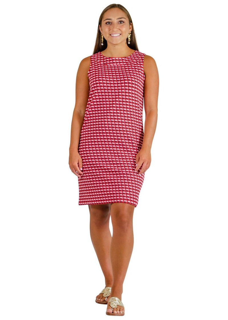 In black, red, and white, our dress is patterned with bulldogs and features a sleeveless shift silhouette. Perfect for any given Sunday, this dress is created as a collaboration with Honey + Hank. The nylon blend is moisture wicking and UPF 50+ sun defense. If you don't know Honey & Hank, here is a "little wink": Texas-based designer, Jenny Smiley, loves a good wink. In life and in design. She coined her 'design with a wink' style by creating commonly loved patterns out of uncommon shapes. At first, you see a tasteful basket weave, stripe, or floral. Looking closer, you'll see the shape of your favorite state, pastime or pet that makes up the pattern Ā the 'aha!' moment that makes people melt!