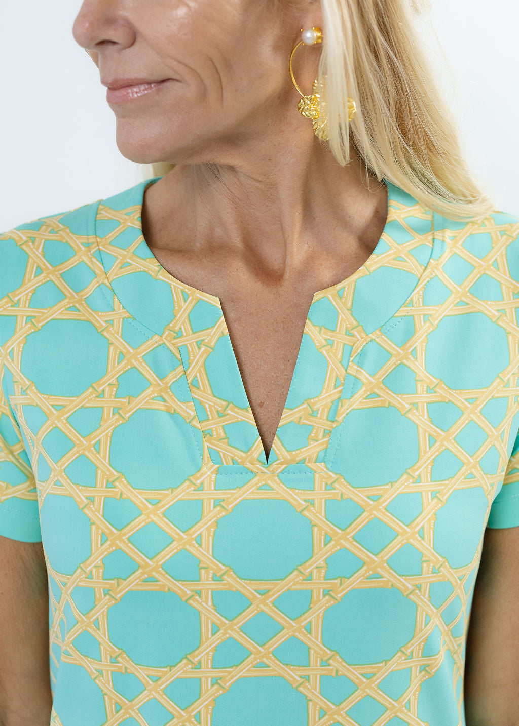 This classic dress silhouette is updated with the bamboo print in green and tan. The colors, the cut, and the style create a dress that's easy to wear and feel at home wherever you may go.