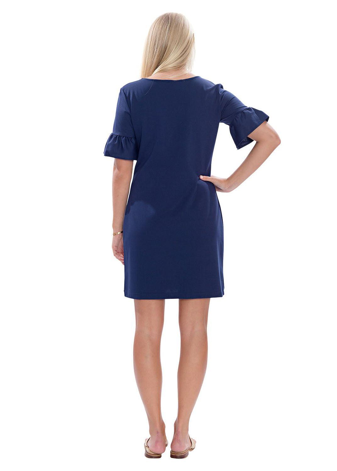 Perfect for fall and the holidays! The Dockside dress is a elegant showstopper with a bell sleeve and a-line shape, it falls just above the knee. Shown here in our navy rayon knit, it is a great weight! Sure to be a favorite in your closet! Model is 5'7" and wearing a size small.