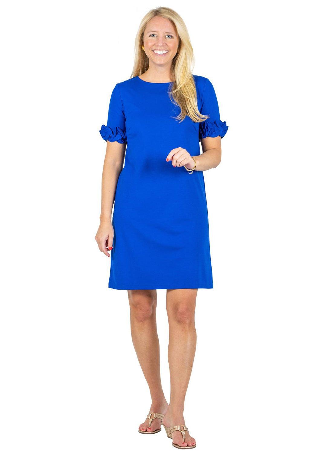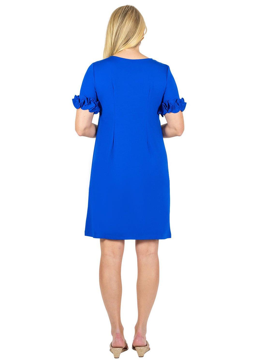 In true royal blue, the Kimberly dress has an impeccable style that is as easy to slip on as it is to love. This selection is made in our exclusive rayon blend. This soft and supple material feels luxurious against the skin and wears well. From the ruffled short sleeves to the confidence boosting back darts, you'll love how you look and feel in our Kimberly Collection.