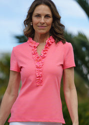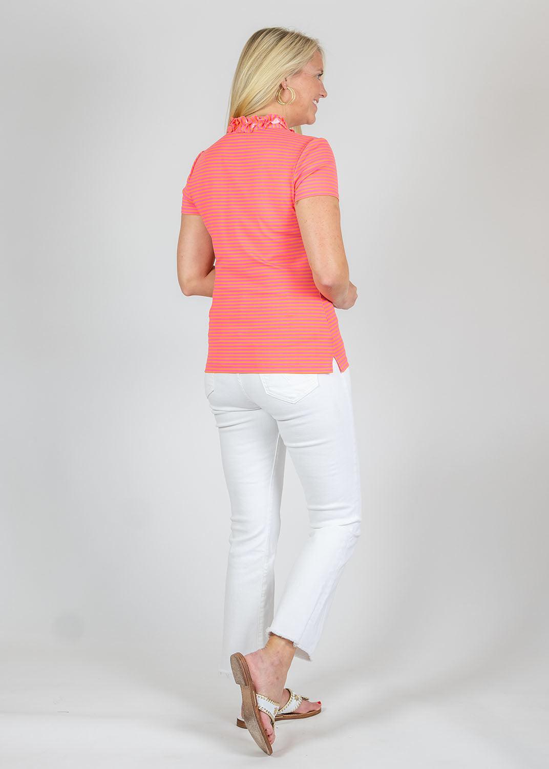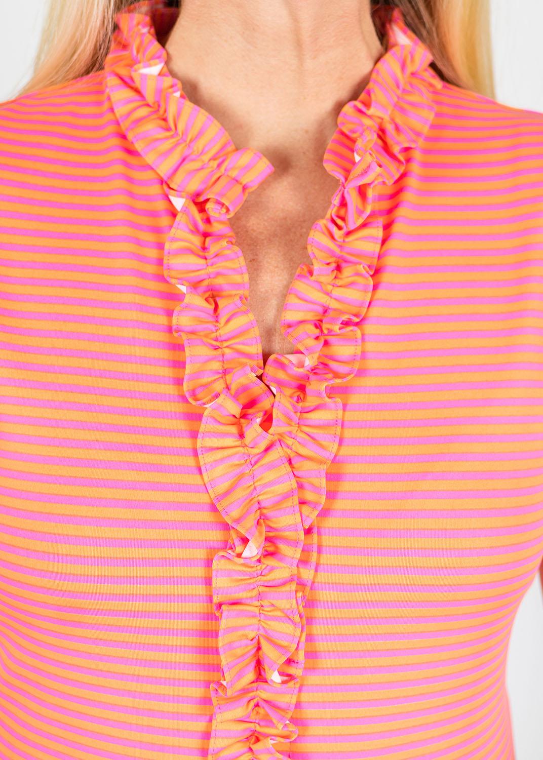 From lunch with friends to hitting the links, our Bailey top does it all. The colorful Juicy Stripe Pink/Orange print paired with the ruffled neck add the perfect touch of fun to any outfit.