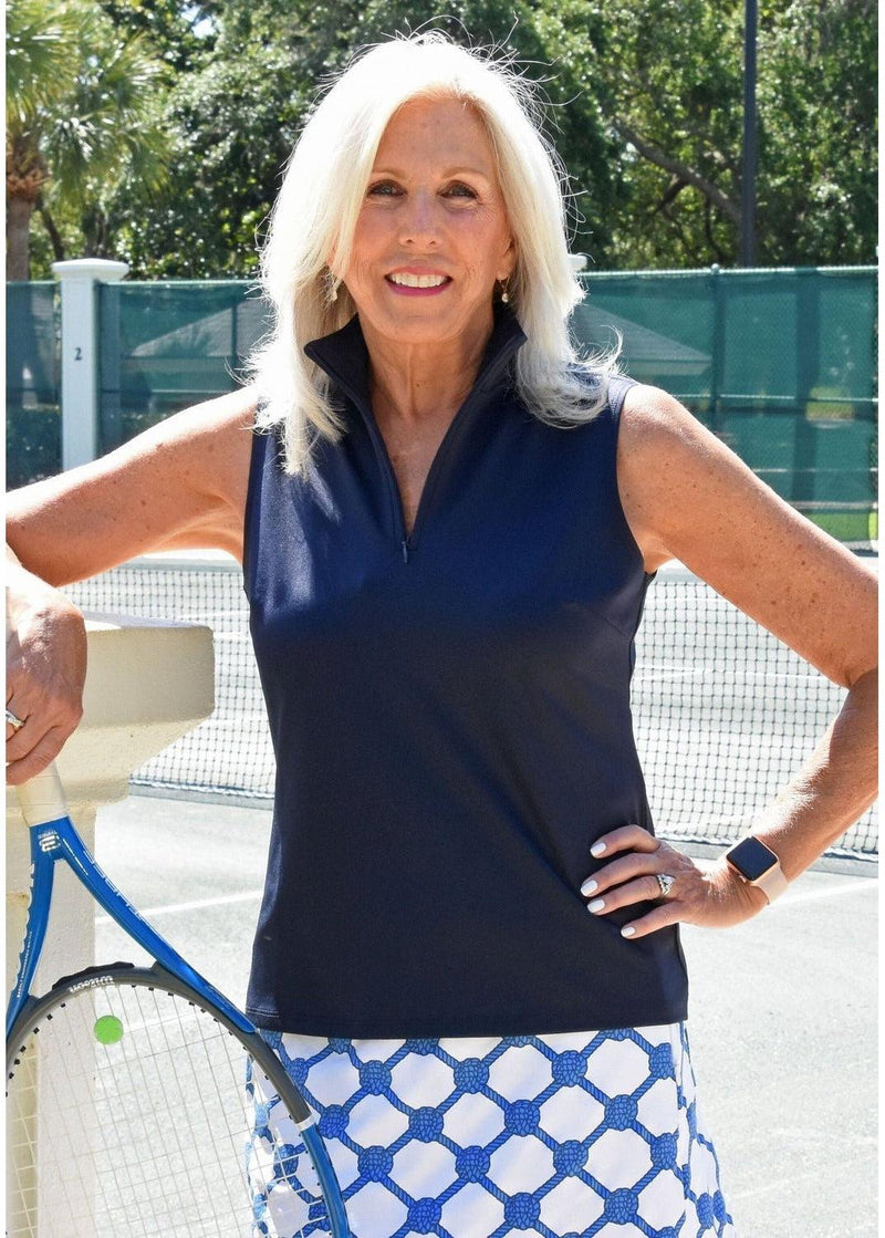 This sleeveless top in a classic navy is a perfect staple piece! With the collared neck, the zipper detail, and the perfect length, the possibilities are endless! Pair it with any of our skorts for a fun, sporty outfit. Or wear it with a pair of jeans for a casual, perfectly put together outfit! Model is wearing a size small.