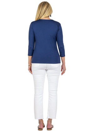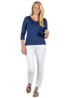 In quietly luxurious navy, our v-neck crew tee is an essential you'll never tire of wearing. This selection is designed with 3/4 length sleeves for coverage.