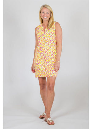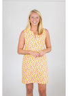 Chic and confident, our Lucille sleeveless dress features an easy to wear silhouette matched with a iconic flower print. The field of dahlias pattern is brightly colored in yellow, pink, orange and green.