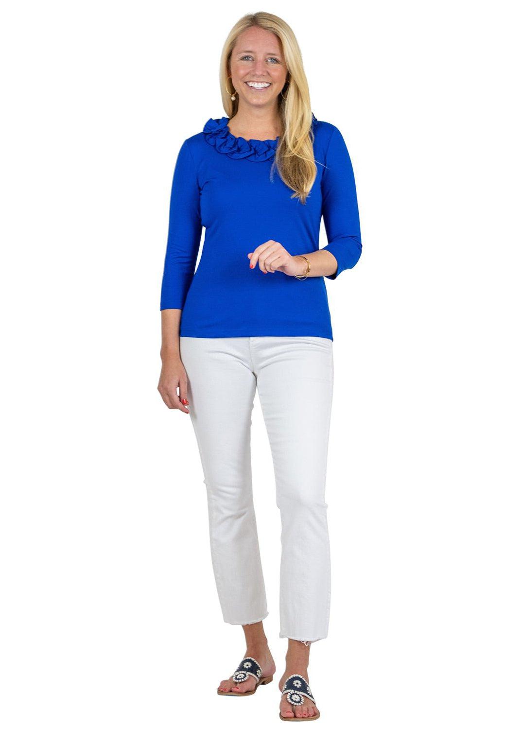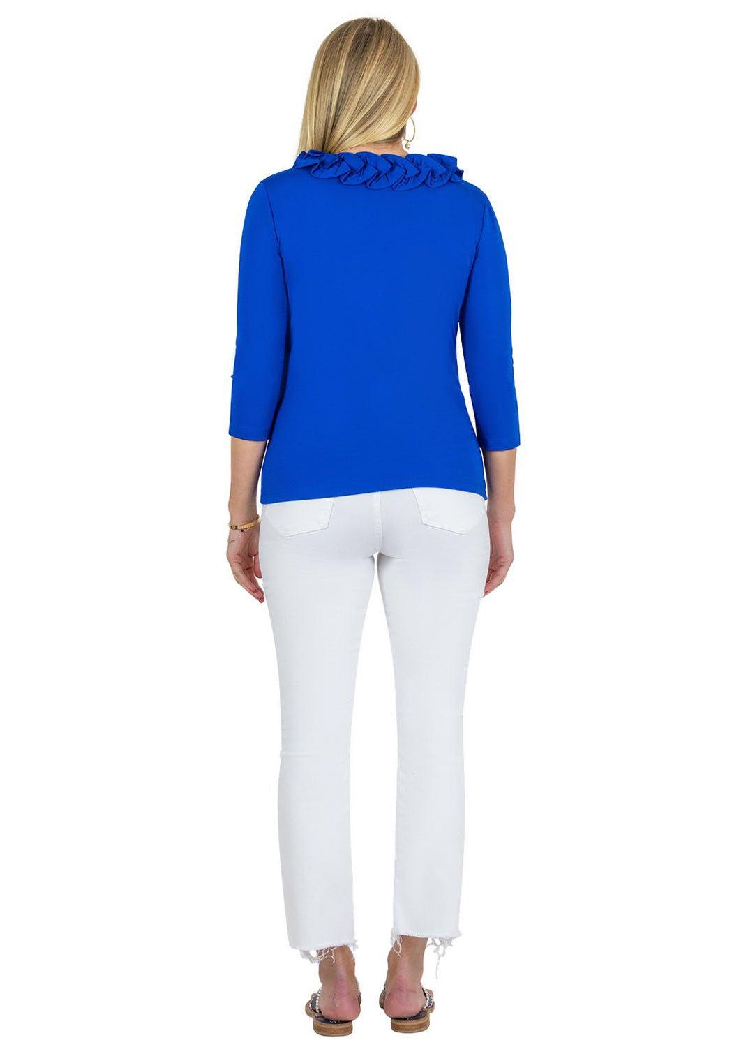 Just look at that color! The Cricket top is made with a 3/4 sleeve design and luxuriously tailored. This soft and sumptuous material looks as good as it feels. Accented by a sculpted ruffled neckline, the 3/4 sleeve top is elegant and confident without being overdone.