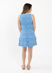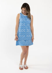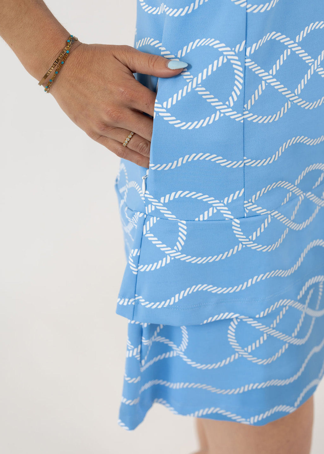 Seaside inspirations pattern the Daisy Collection with a nautical print. This selection is a chic athletic design with white trim, zippered pockets, and a sleeveless A-line cut.