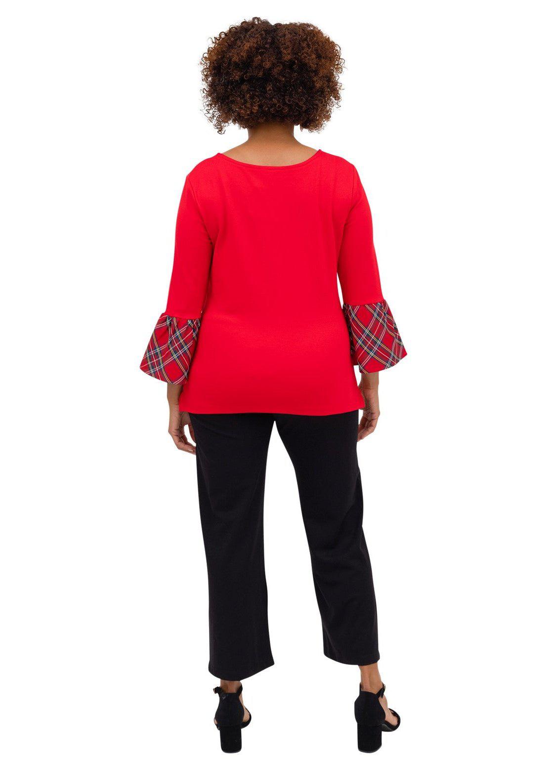 Ring in the holiday season with our bell sleeved top! With red plaid accents, this selection has an easy to wear heavier weight red ponte design to keep you warmer during the cold months. Perfect for wearing with slacks or a skirt, this selection is easily dressed up or down.
