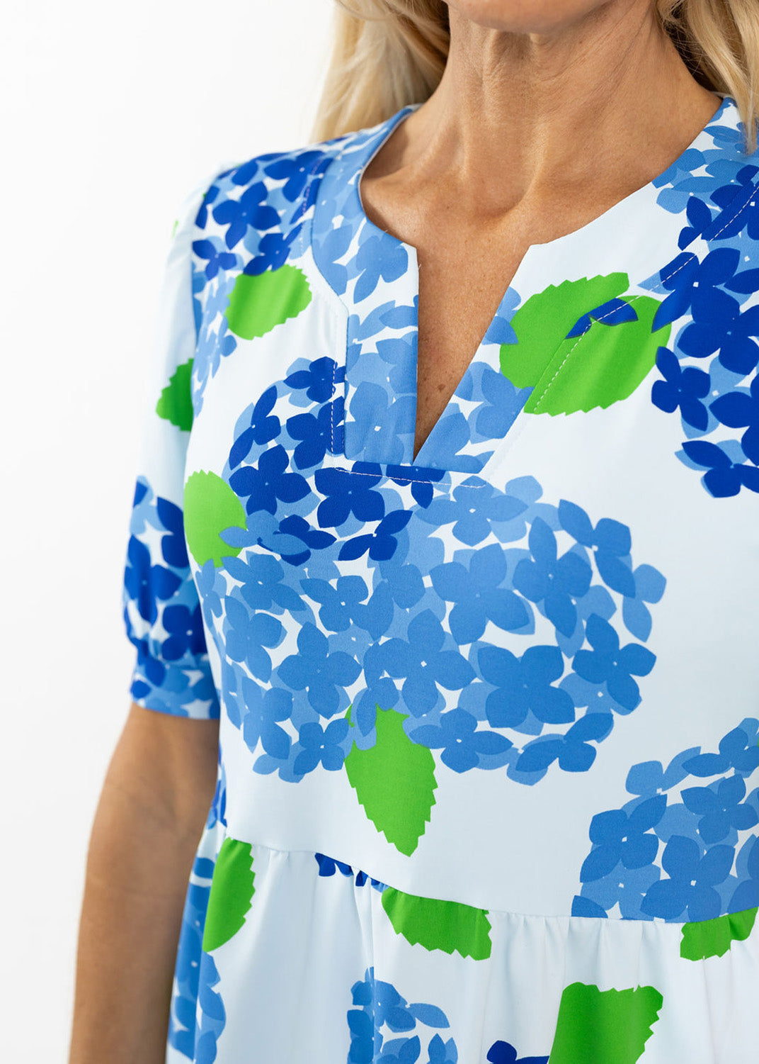 Chic and confident, this short sleeved hydrangea dress is a a piece you'll wear year after year with the quality tailoring. The blue dress features two pockets, a v-neckline, and a layered look.