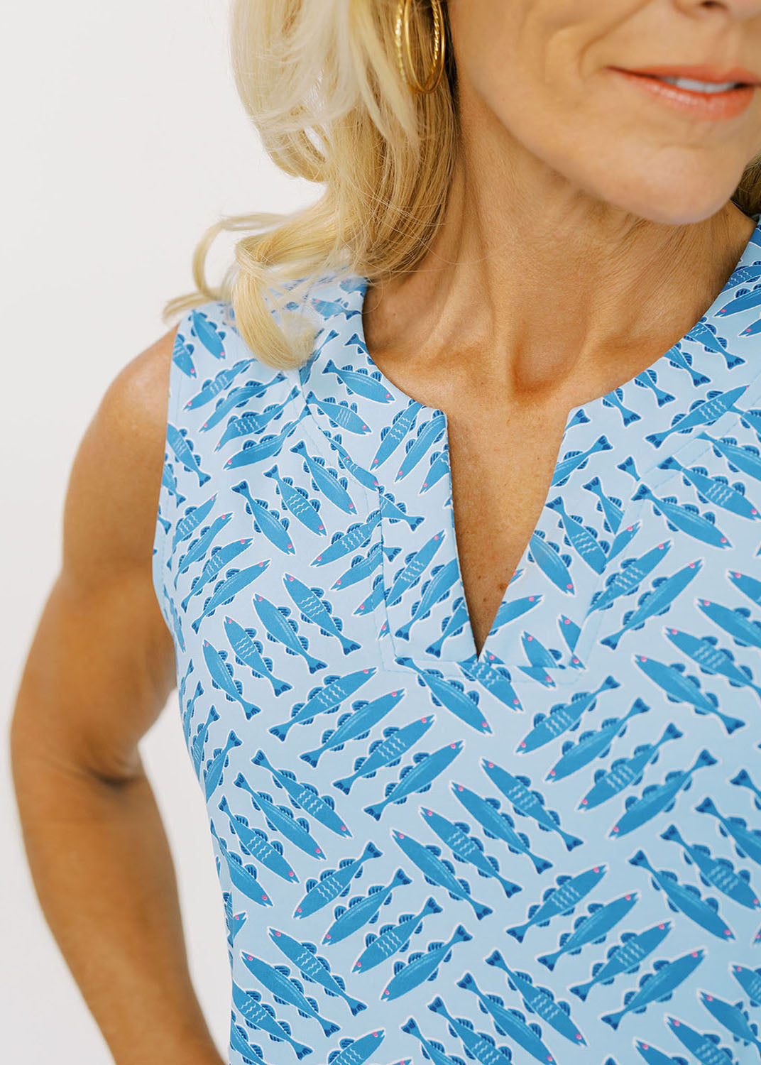 Seaside inspirations create the fresh catch pattern for this v-neckline dress. Designed in in gorgeous blue, the Lucille's sleeveless design is ideal for layering with a cardigan or jacket.