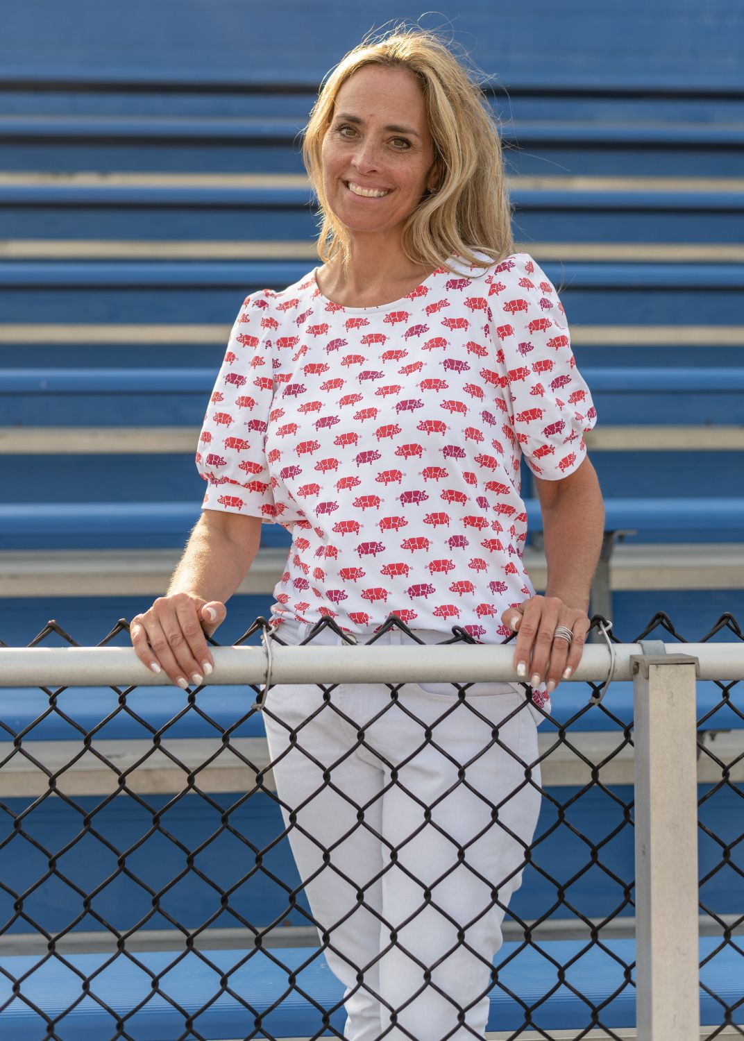 Created for the Madison line, this top features our Arkansas print and has a gentle balloon sleeve cuffed above the elbow. Brightly colored in red and white, a great game day top.