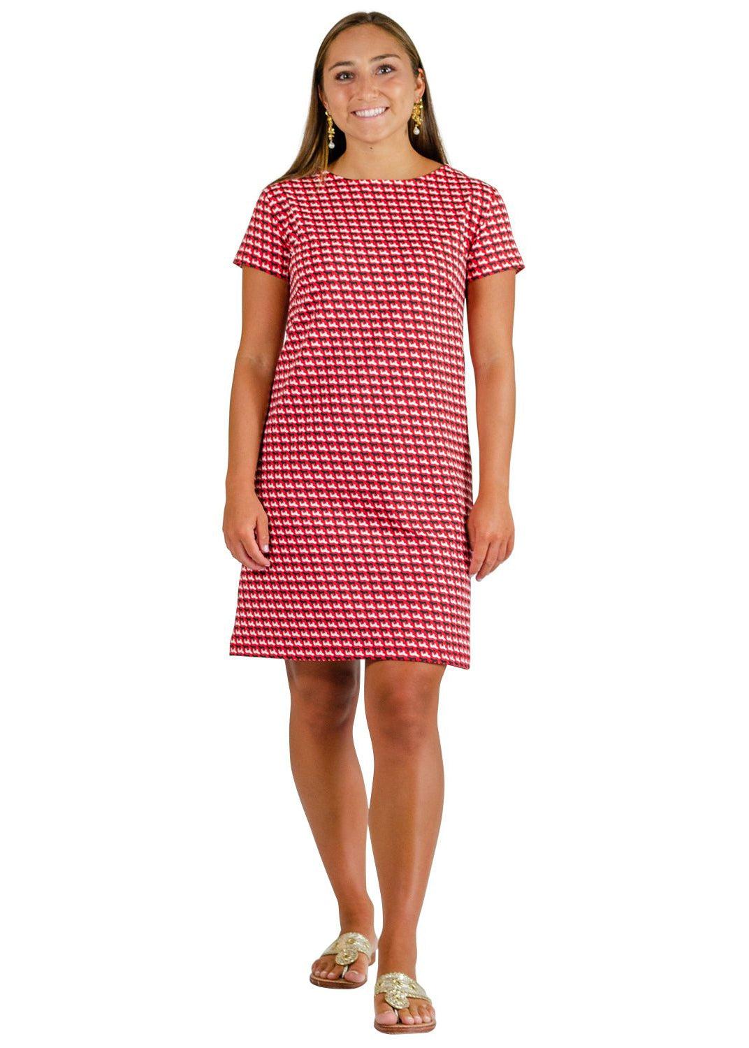 Get in the game in our Marina dress! Patterned with bulldogs in black, red, and white, the dress has short sleeves and two tailored back darts. This selection is made in the United States in our nylon blend as part of a collaboration with Honey + Hank. The fabric provides moisture wicking management and UPF 50+ sun defense. If you don't know Honey & Hank, here is a "little wink": Texas-based designer, Jenny Smiley, loves a good wink. In life and in design. She coined her 'design with a wink' style by creating commonly loved patterns out of uncommon shapes. At first, you see a tasteful basket weave, stripe, or floral. Looking closer, you'll see the shape of your favorite state, pastime or pet that makes up the pattern Ā the 'aha!' moment that makes people melt!