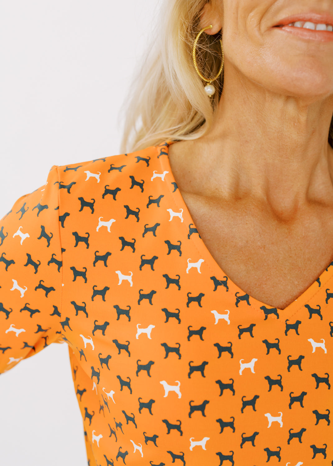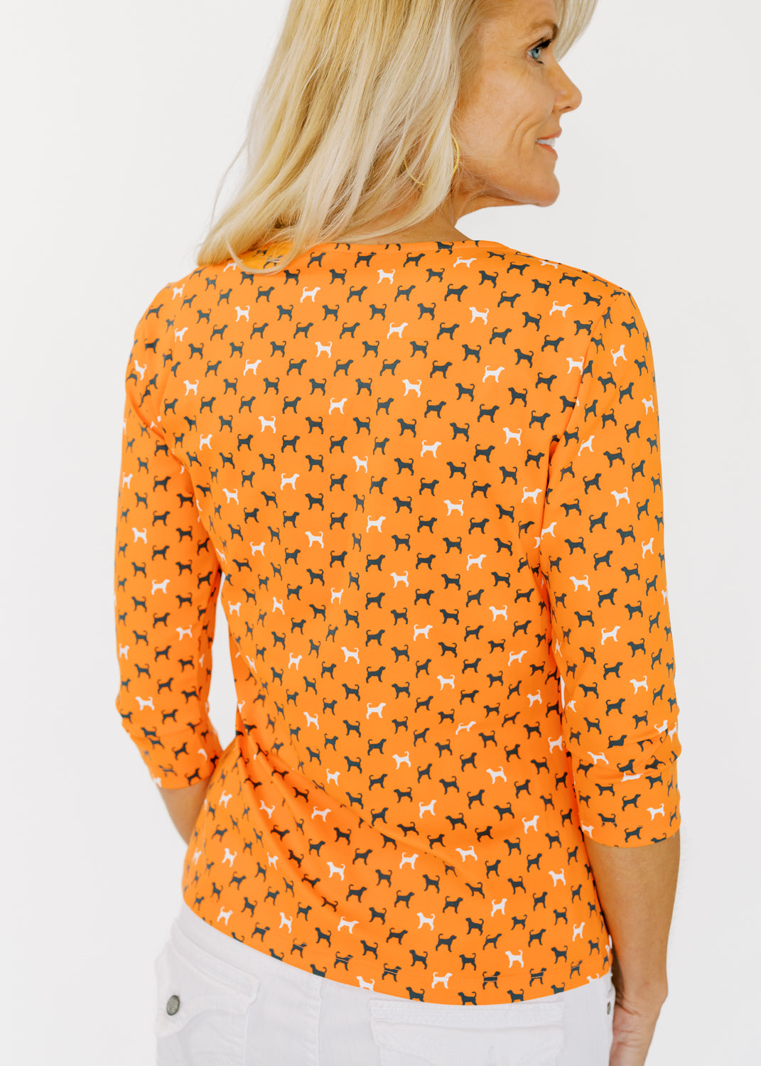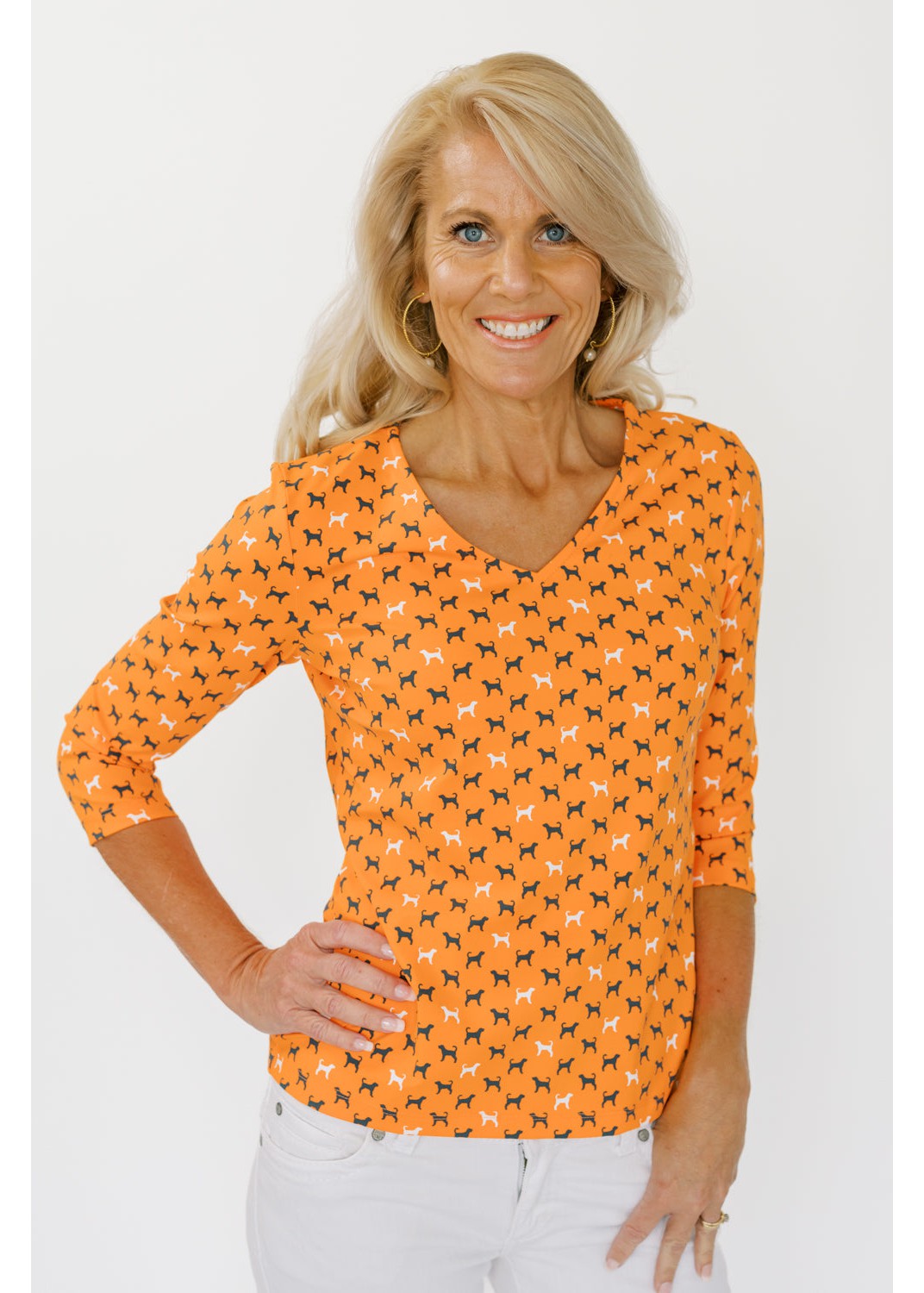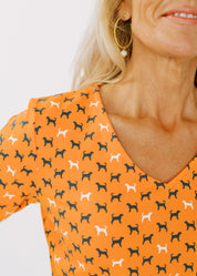 Our classic v-neck crew tee is embellished with a Tennessee hound dog print on vivid orange! You'll love the fit and feel of this 3/4 sleeve design.